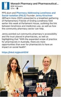 In Australia, Jenny has presented on loneliness at peak national pharmacy education conferences (Pharmaceutical Society of Australia) and at a Parliamentary House event championing the pivotal role that pharmacists can play in addressing loneliness.