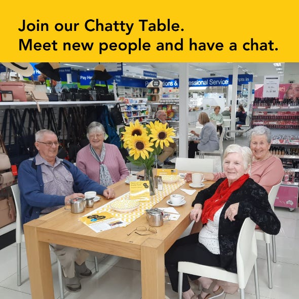 A pharmacy has set up a “Chatty Café” in the café that is part of their pharmacy. The Chatty Cafe initiative is about building friendly social connections to brighten someone's day. The pharmacy reserves a Chatty Table in their cafe every Friday with a message that there is no need to RSVP, just show up, take a seat, meet new people and have a chat. There will always be someone to listen and care.
